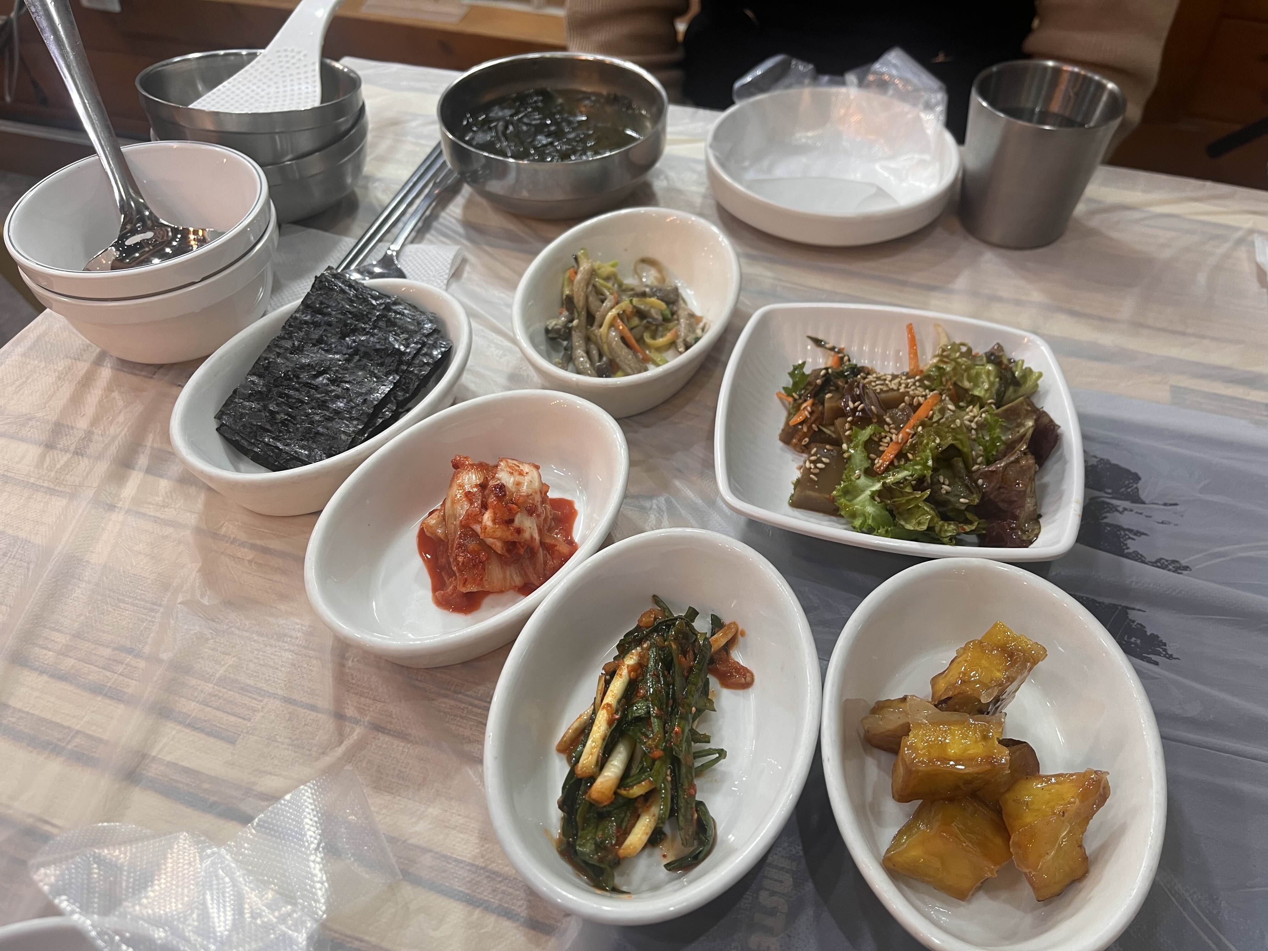 미역국, 김, 김치, 버섯볶음, 파김치, 맛탕, 도토리묵!