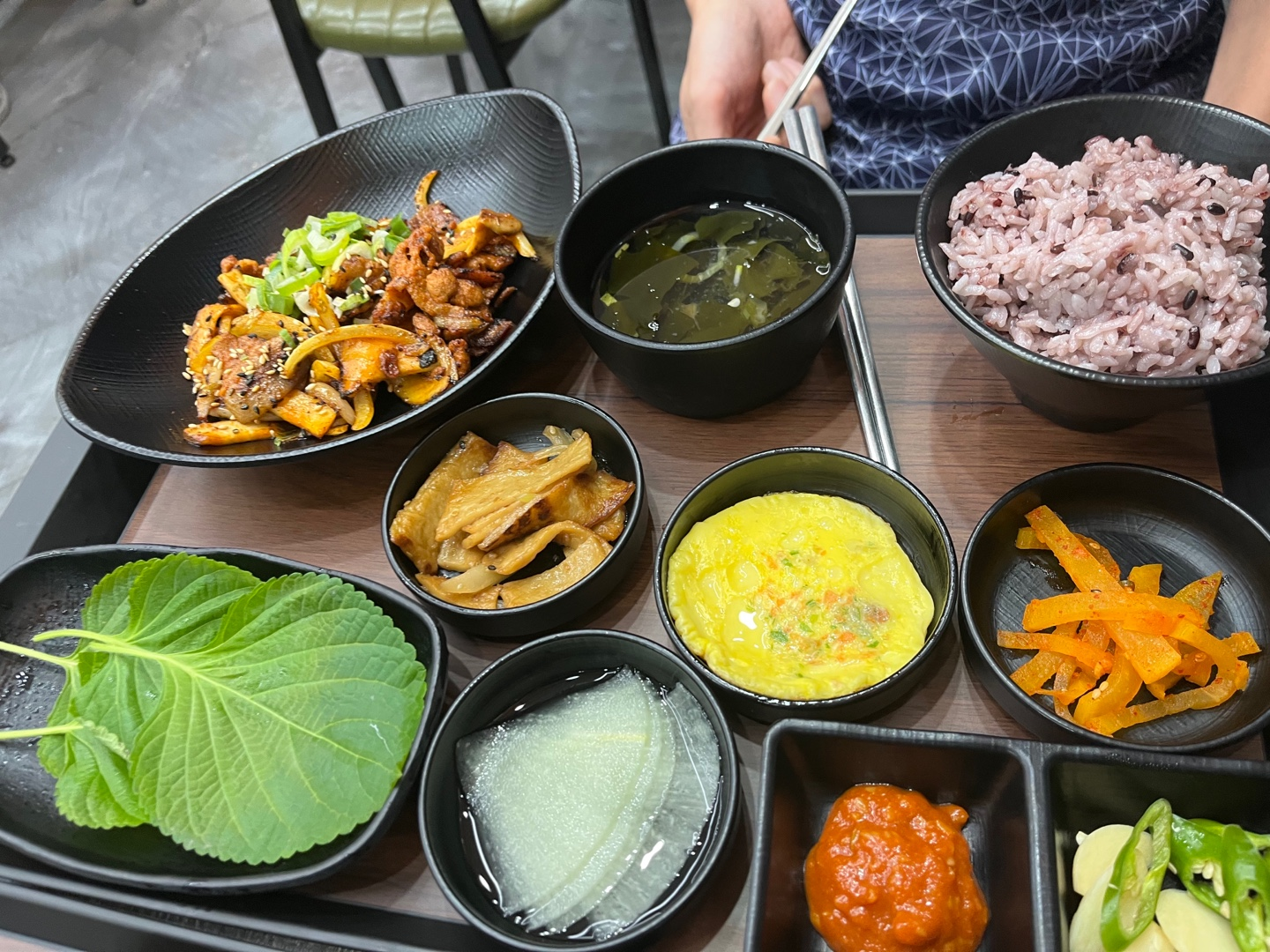 왼쪽이 바싹직화고추장불백이고, 오른쪽이 돼지목살김치찜입니다. 오뎅볶음과 오믈렛?, 단무지무침? 등 밑반찬이 제 입맛에 맞아서 좋았습니다. 불백종류에는 깻잎쌈과 무쌈, 마늘/고추와 쌈장, 그리고 미역냉국이 같이 제공되어 나왔습니다. 김치찜에는 김과 계란찜이 같이 나왔네요. 기본반찬으로 나온 오믈렛은 맛있었는데, 계란찜은 간이 약간 밍밍해서 별로였던 것 같습니다. 계란찜이 나오는데, 오믈렛을 중복으로 주는 건 센스가 좀 부족한듯! 김치찜에도 계란찜 대신에 오이냉국이 나왔다면 밸런스가 더 좋았을 거 같아요.