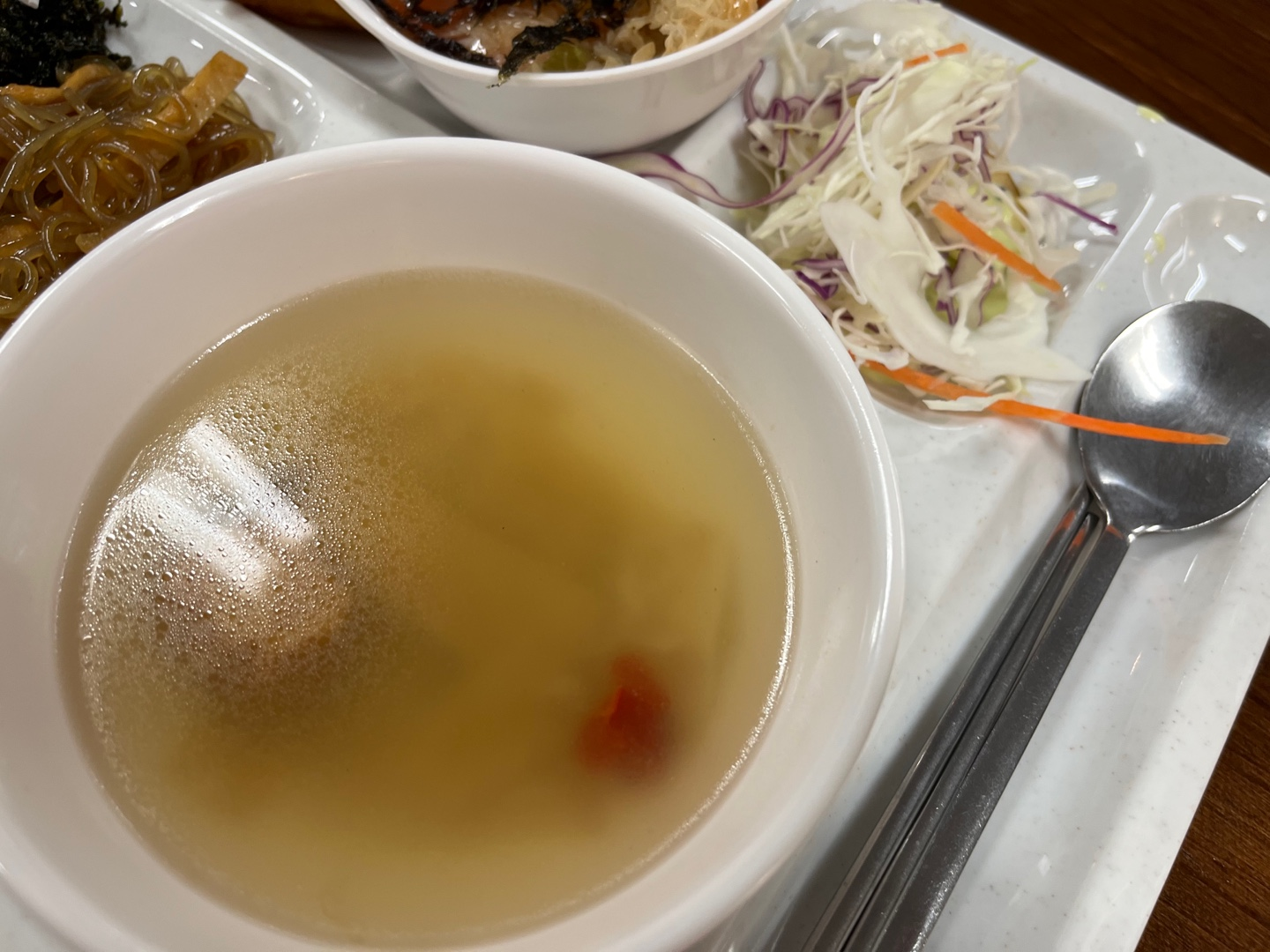 샐러드도 사과 잘라 놓은 거랑 양배추 슬라이스 있었고 소스는 두 가지 있었는데 초록색 소스 선택했네요. 상큼하고 맛있었어요. 국은 따로 퍼주는데, 어묵국이었고 어묵은 조금, 국물은 많이 주네요. 딱히 어묵국이 메인이라고 생각은 안 했어서 저한텐 적당한 양이었어요. 비슷한 메뉴만 주구장창 내놓지 않는다고 하면 괜찮은 가성비, 괜찮은 맛인 거 같아요! 라면 먹고 싶을 때 계란 두 개 넣고 끓여서 먹어볼까바요.