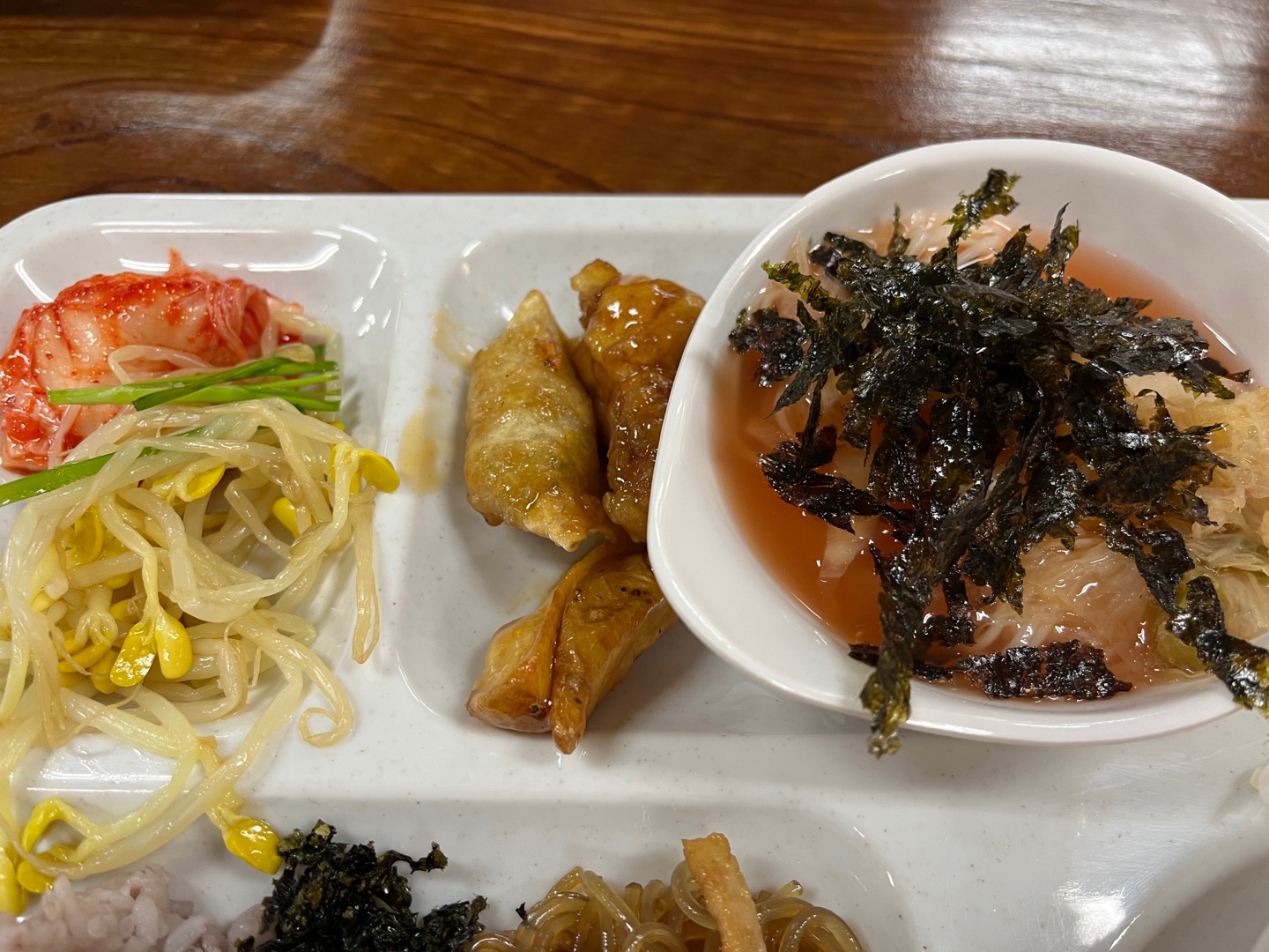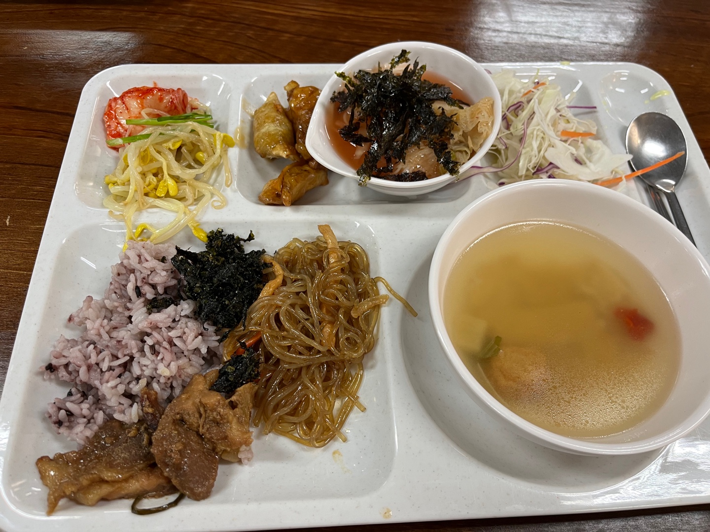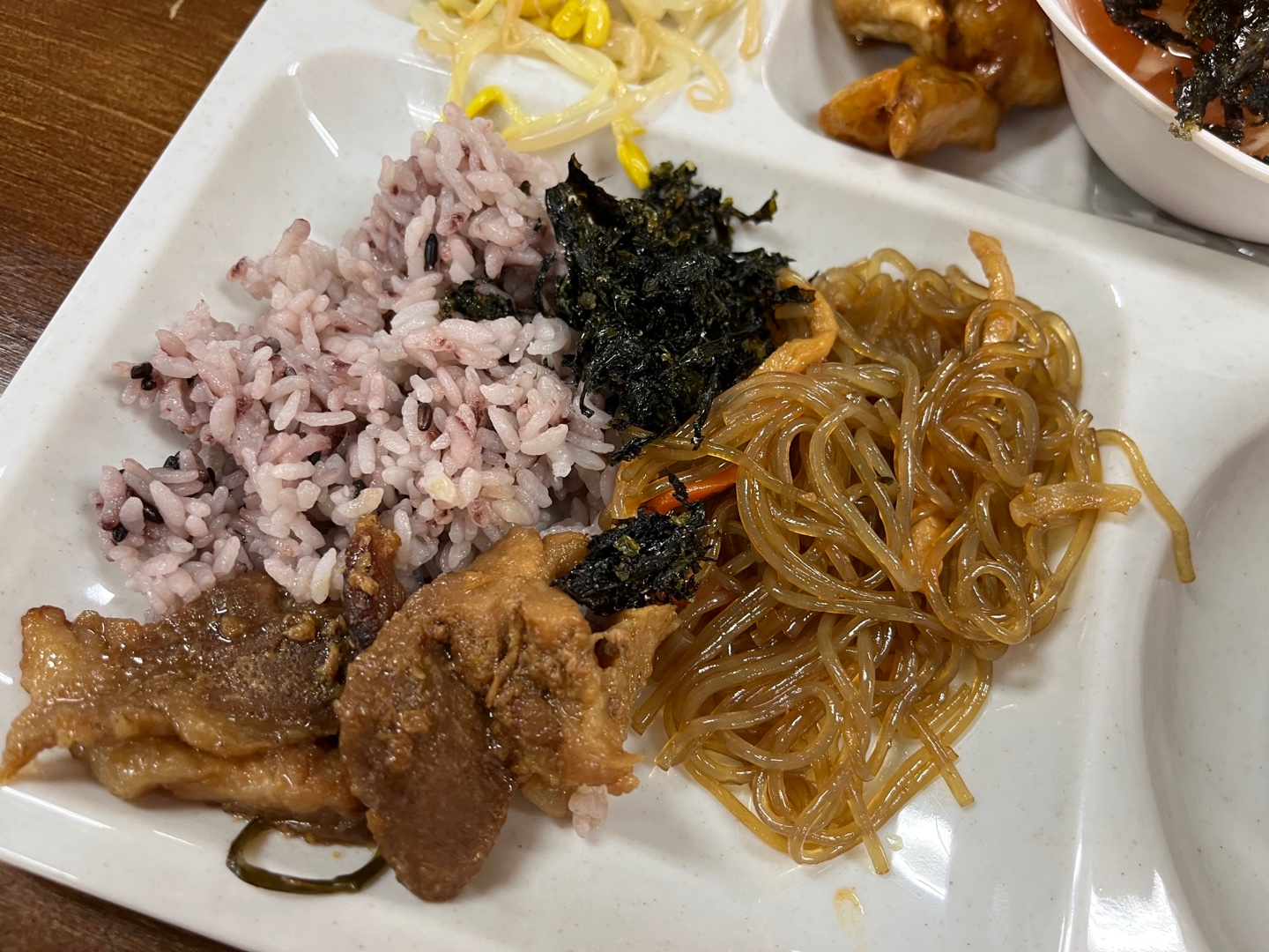 간장돼지불고기랑 잡채가 메인인듯 했어요. 간도 적당하고, 파래김도 밥이랑 같이 비벼 먹기 좋았어요.