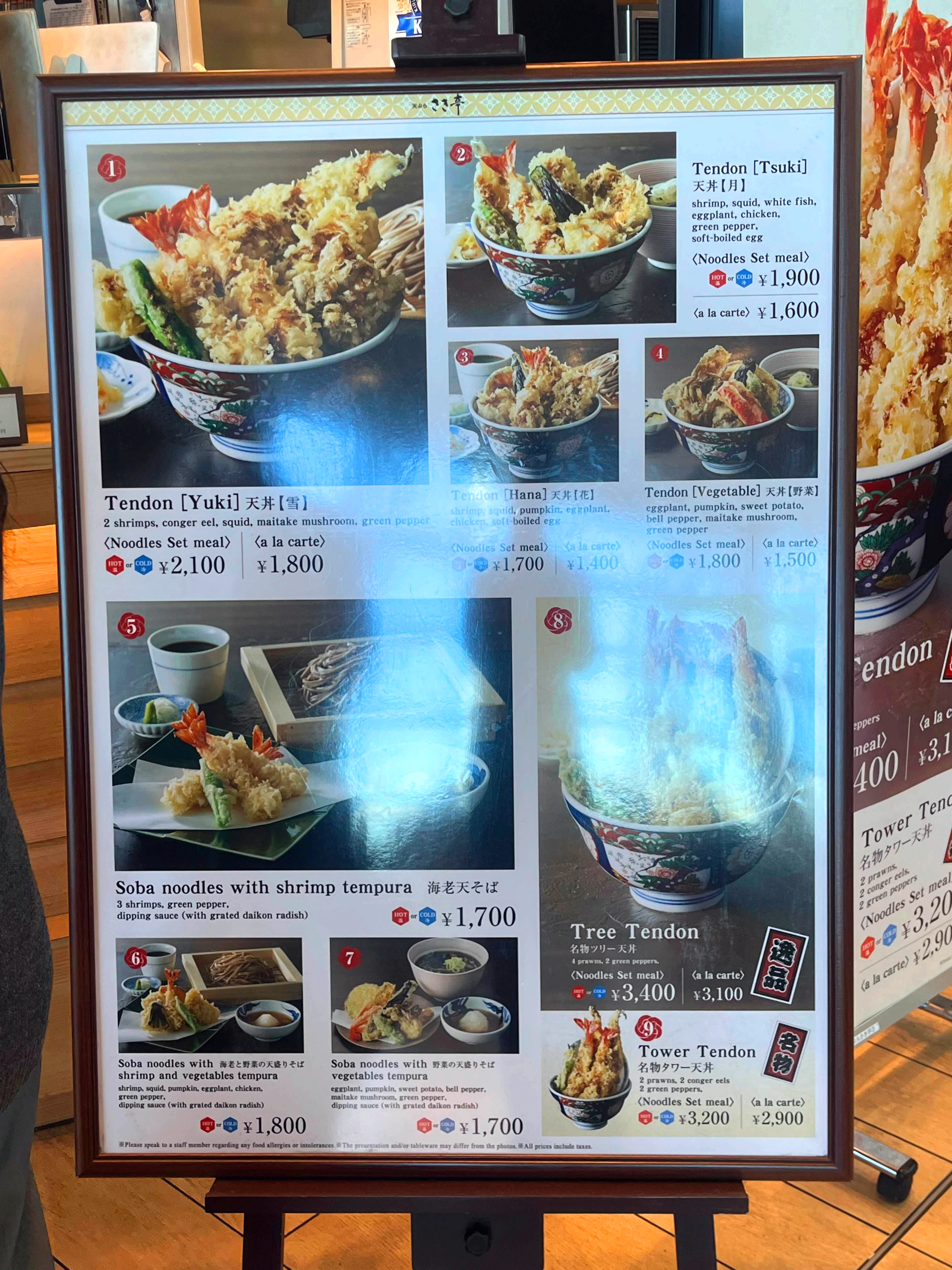 제일 싼 게 하나텐동으로 1,400엔, 새우1 오징어1 단호박1 가지1 치킨1 반숙계란1가 들어 있어요.가격대 괜찮지 않나요? 제일 비싼 게 왕새우 2마리와 붕장어튀김이 2개, 고추튀김 2개가 들어 있는 타워텐동 2,900엔.