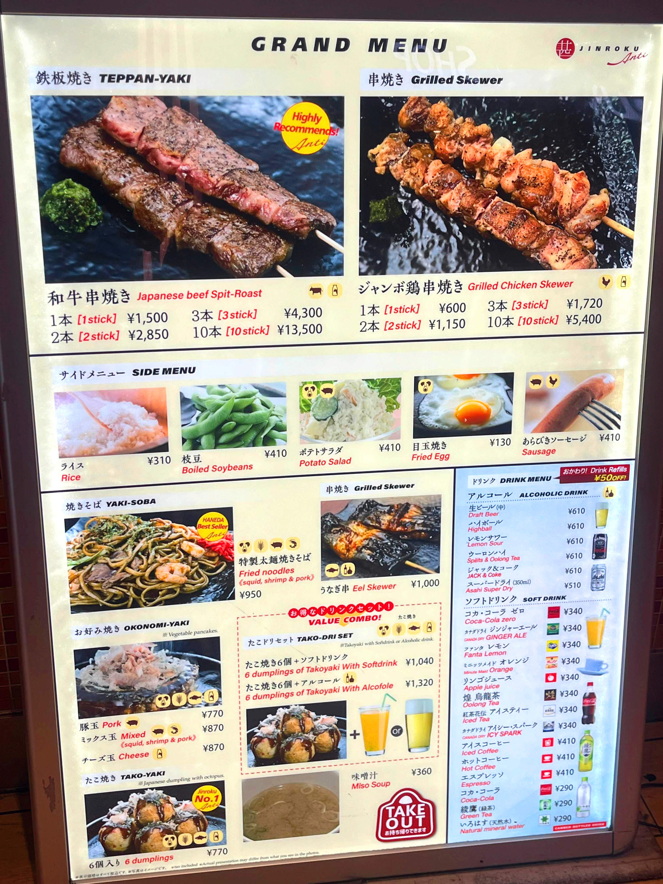 꼬치구이로 와규와 닭, 장어 등이 있었고 가격은 위 메뉴판을 보시면 알겠지만 꽤 비쌉니다.