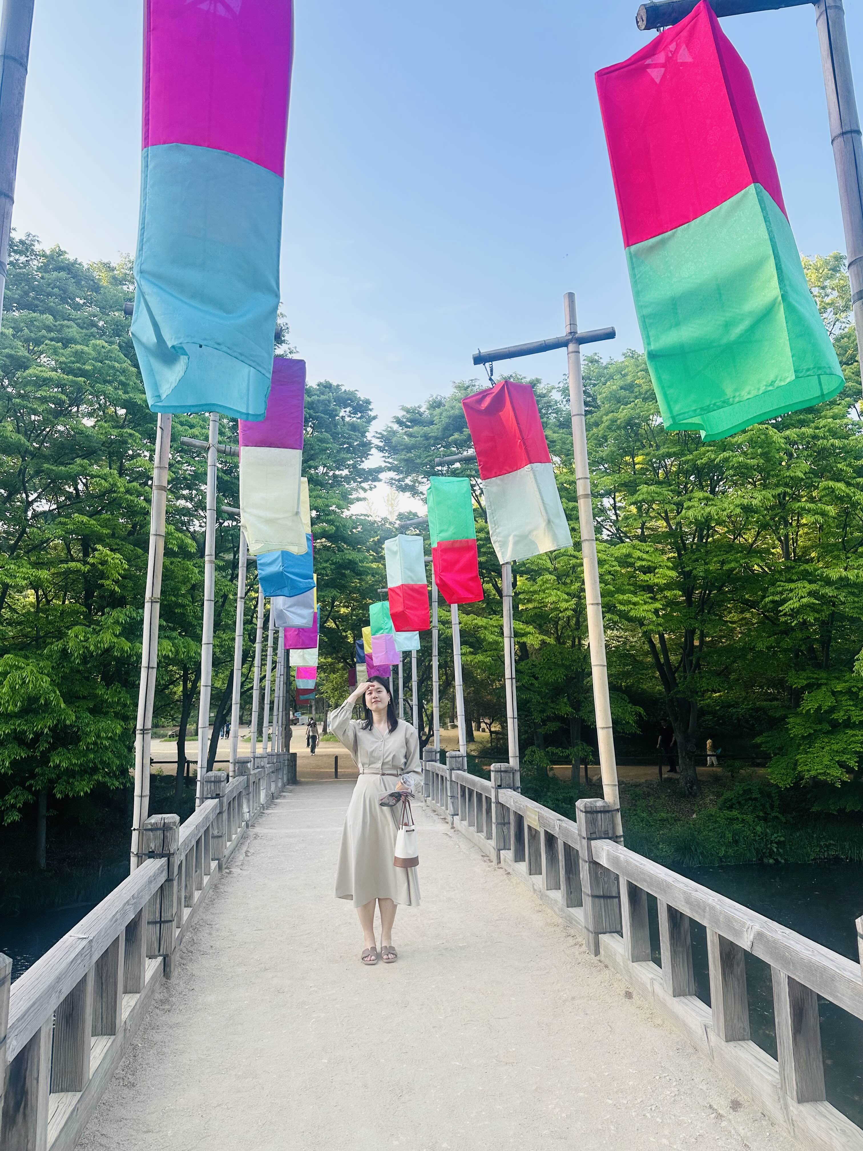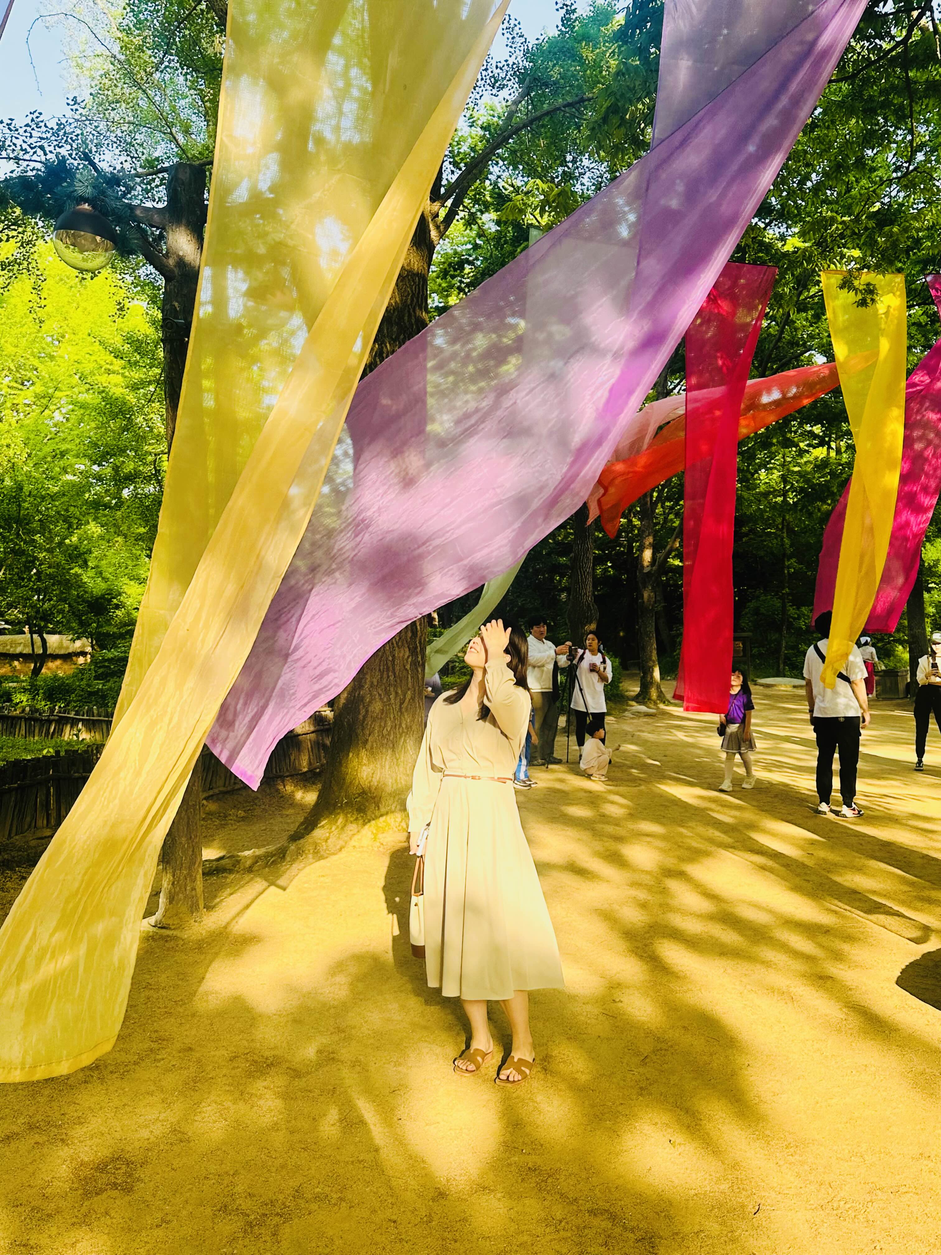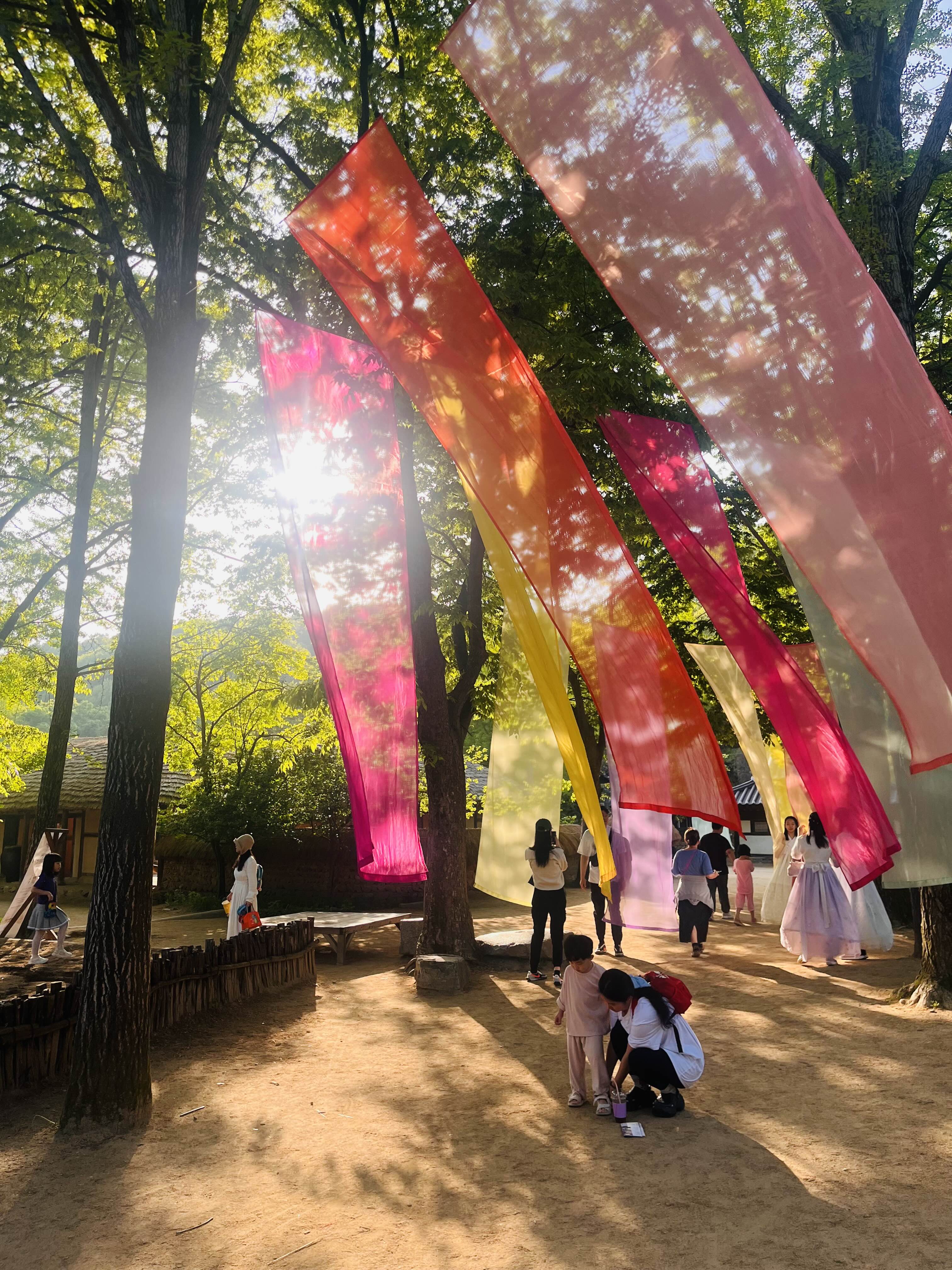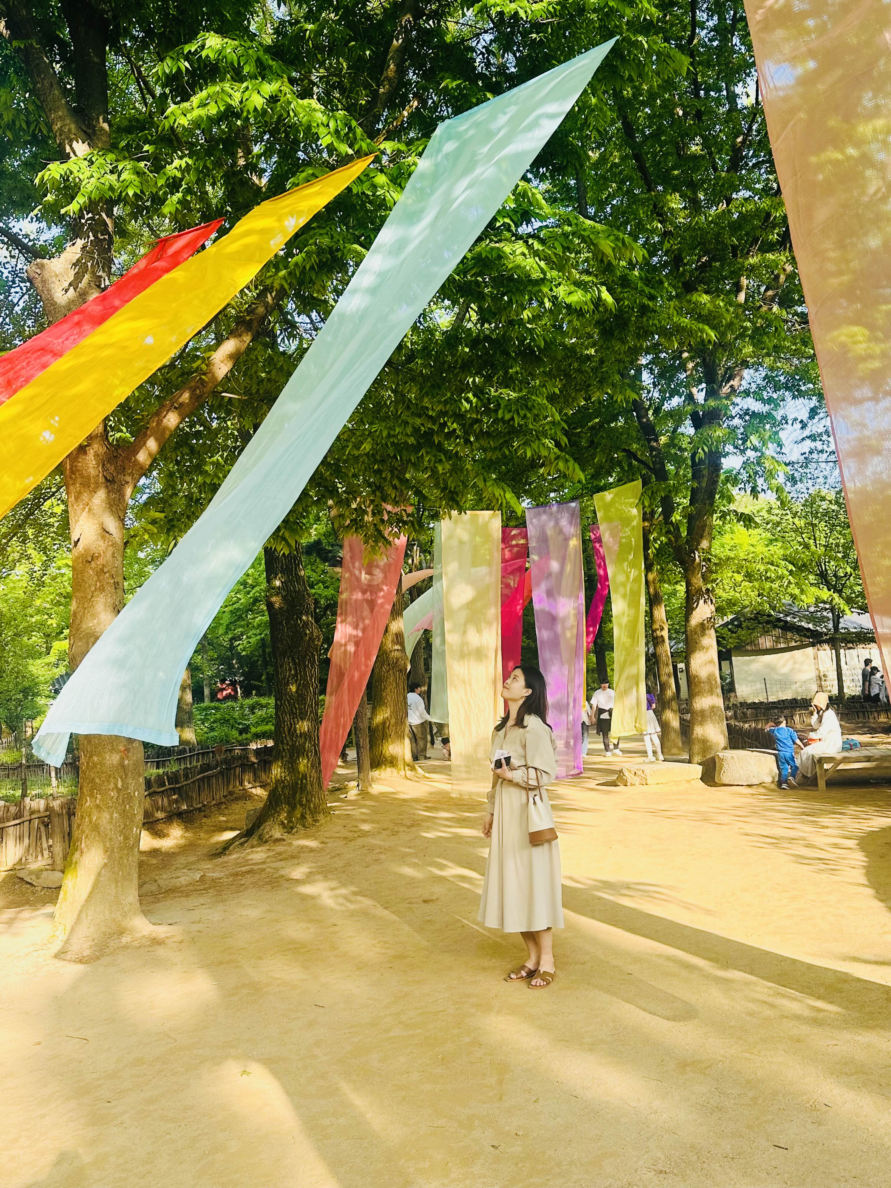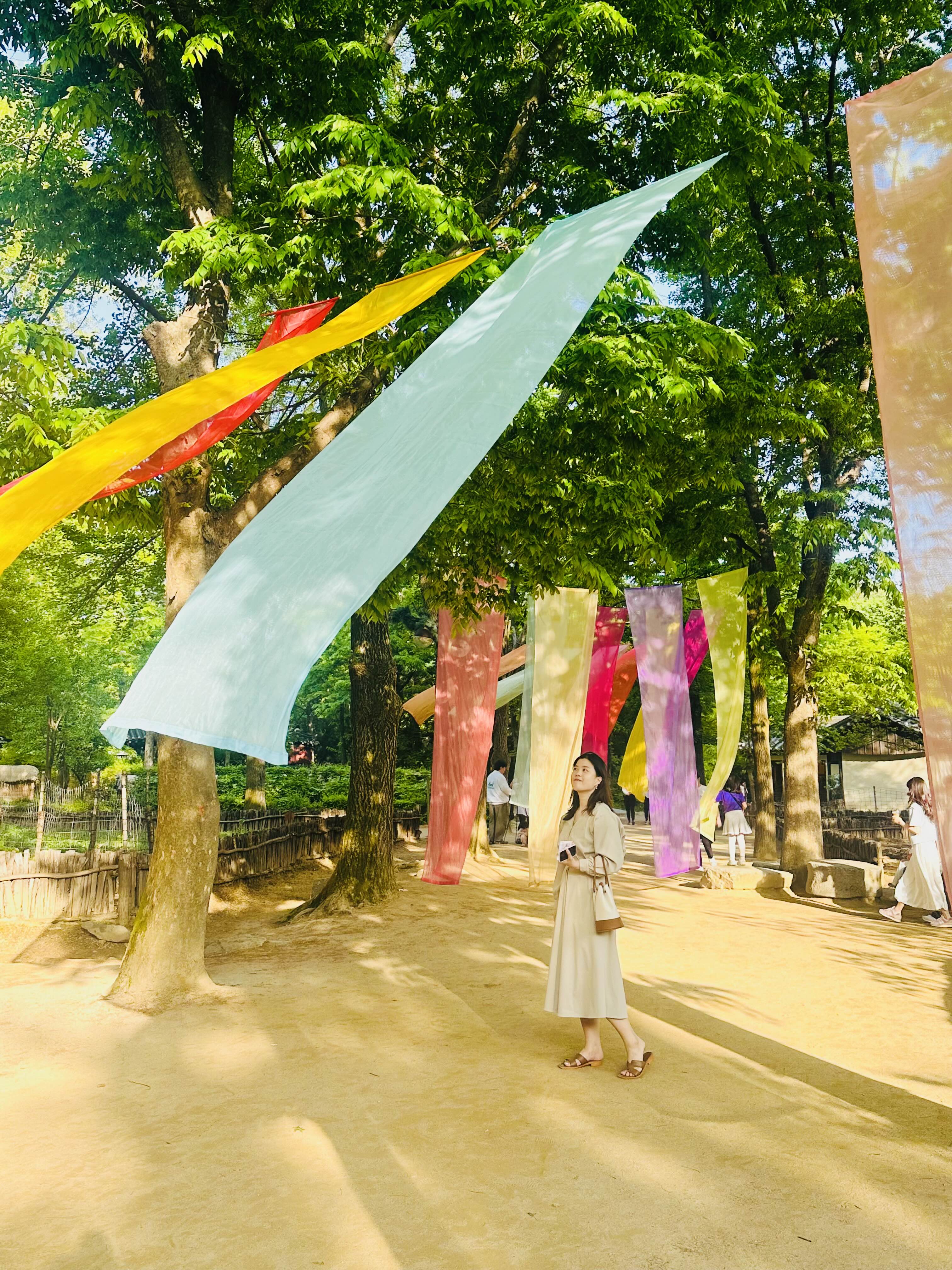 날씨가 참 좋은 날이었는데, 울창한 나무들에 색색깔 천들이 걸려 있는 곳은 사진이 정말 잘 나오더라구요.