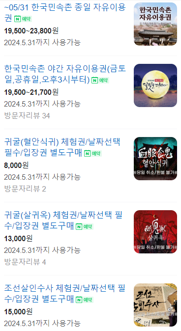 귀신의집이나 체험, 만들기 이벤트는 별도 구매(예약)가 필요합니다. 저는 오후 4시쯤 가서 야간 자유이용권으로 이용했는데, 굳이 별도구매해야되는 체험을 하지 않아도 공연장과 공터에서 하는 공연과 이벤트들이 많고 민속촌 자체가 볼거리가 많아서 충분히 좋은 시간 보냈답니다:)