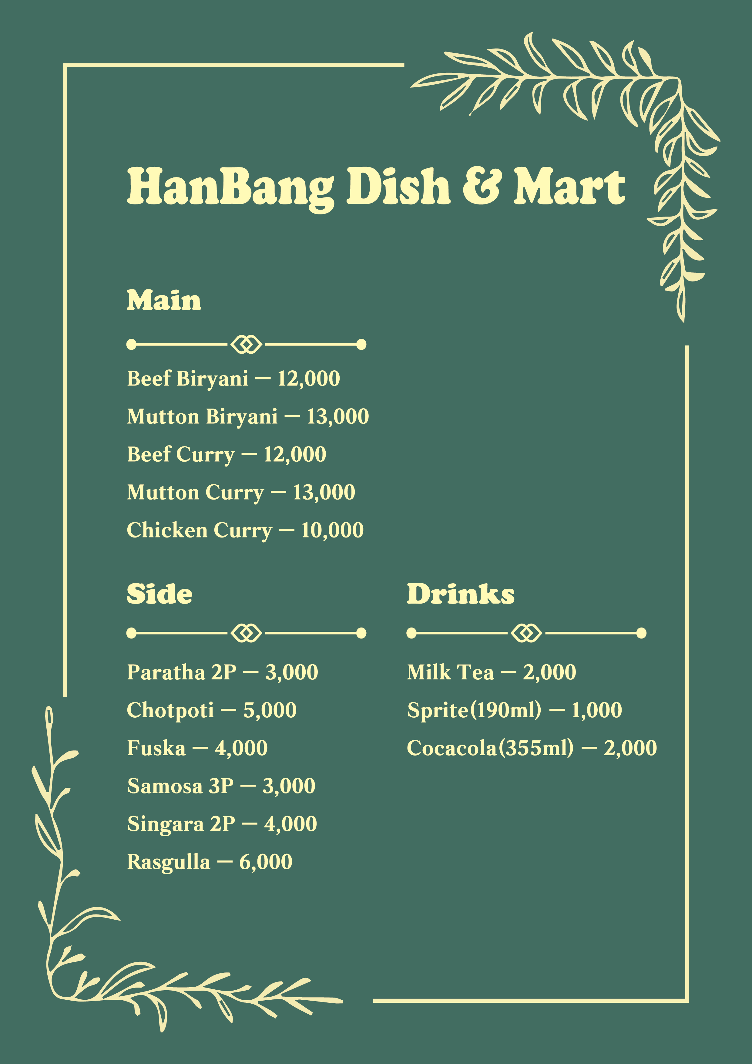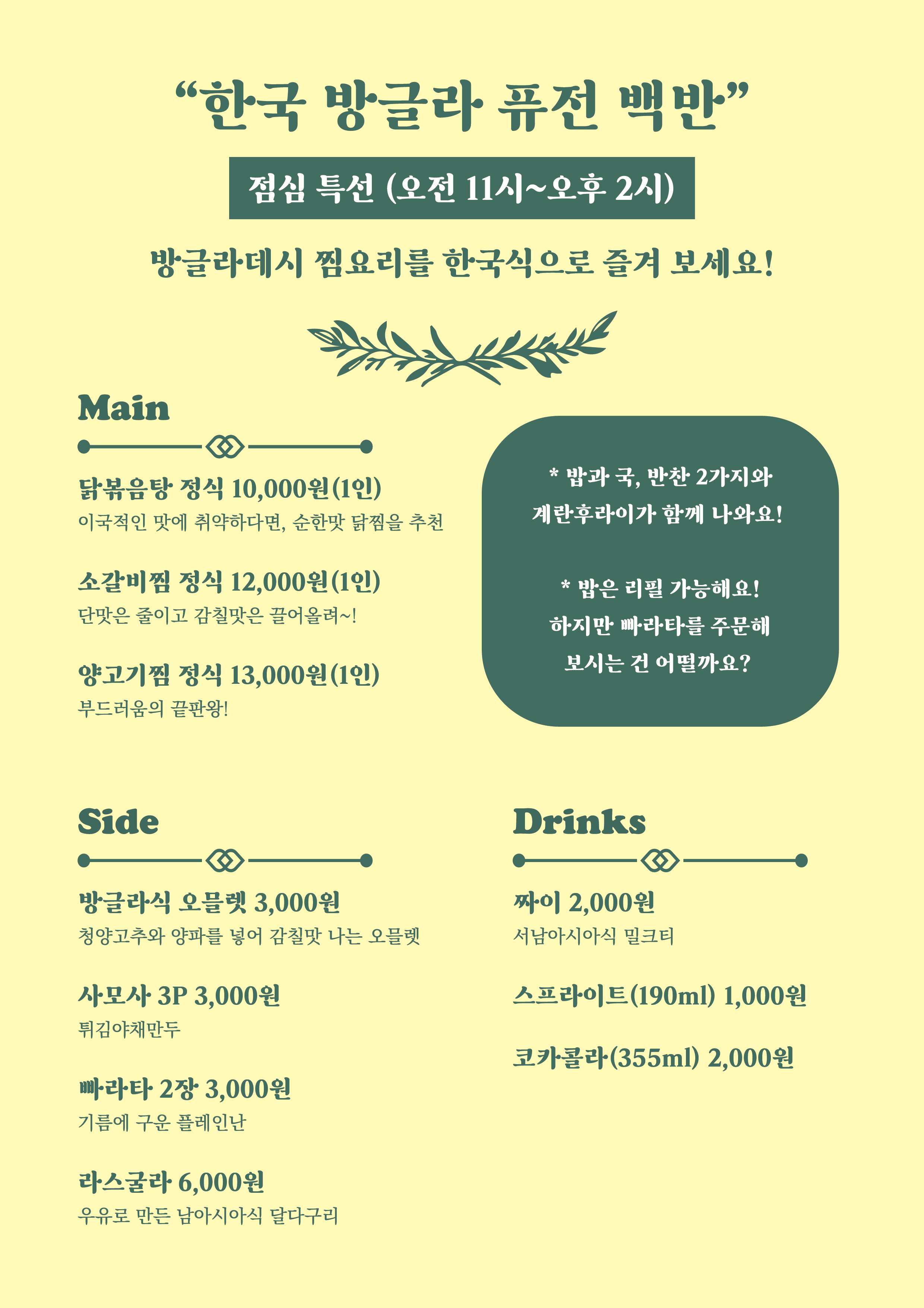 주말 저녁에는 점심특선 외에 비리야니와 푸스카 등 다른 방글라데시 요리들도 드실 수 있어요.