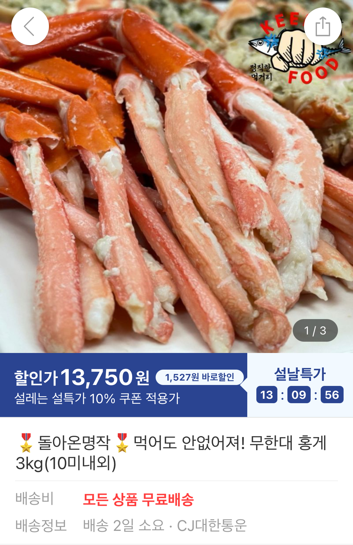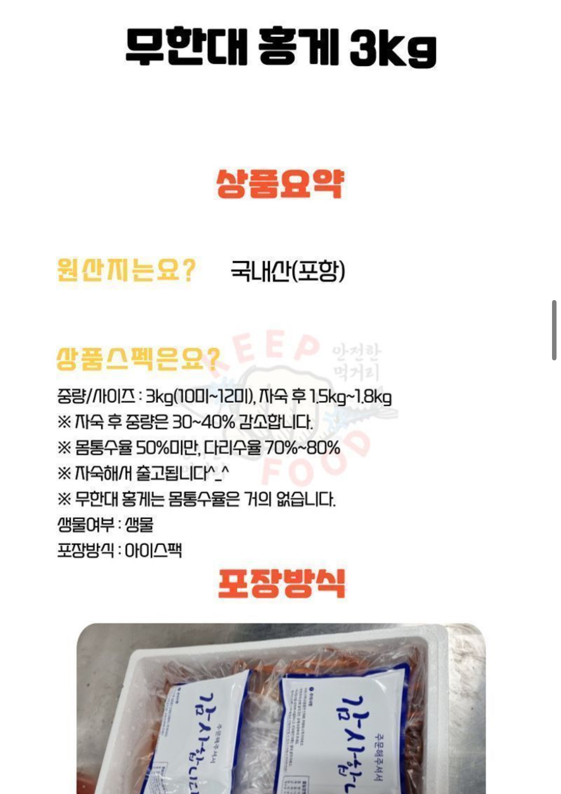 저는 게를 좋아하긴 하지만 게가 비싸다는 인식이 있어서 따로 게만 먹으러 가거나 한 적은 없었는데요. 쇼핑어플에서 홍게3kg가 14,000원밖에 안 하는데 후기가 너무 좋길래 한 번 구매해보았습니다. 가격이 싼 이유는 몸통수율이 거의 없기 때문이래요. 다리도 얇음 ㅎㅎㅎ메인사진에 있는 다리수율은 절대 아니고 저거의 1/3 정도..?