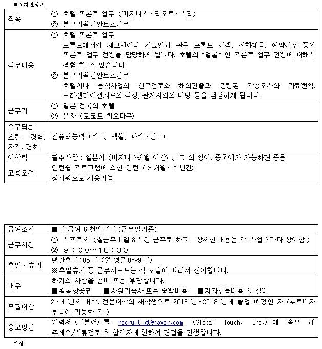 그래서 캐나다영어연수를 알아보다가 학교후배가 공유한 일본호텔인턴 채용정보를 보게 되었어요.