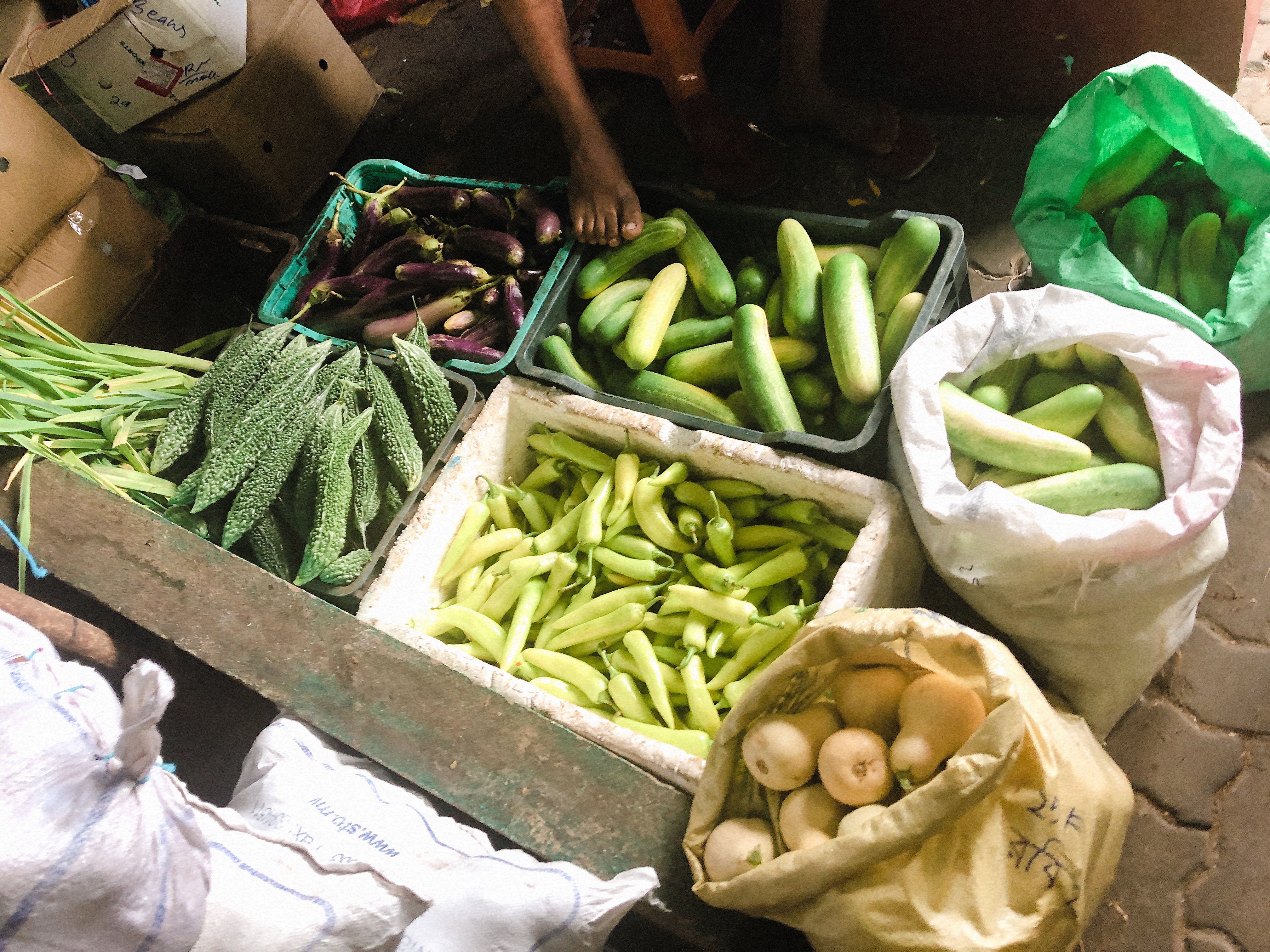 시장에 들어서자마자 양옆을 바나나 행렬이 화려하게 장식하고 있었어요. 바나나도 몰디브에서 생산하는 과일 중 하나인가봐요. 태국이나 대만과 비슷한 기후라고 생각해서 망고나 파파야가 있을 줄 알았는데, 시장에도 리조트 뷔페에도 보이지 않는 걸 보니 몰디브에서는 생산하지 않는 것 같습니다. 나무에서 나는 작은 견과류들도 많이 있었어요. 피망이나 파프리카로 보이는 것도 있었는데, 한국과는 다르게 크기는 더 작고 색이 더 청량해서 예뻐보였어요. 파프리카 옆에 있는 큰 애호박처럼 생긴 야채는 제가 오키나와에서 살 때도 먹어봐서 아는데, 노각이라는 야채예요. 한국에서도 구할 수 있지만 아마도 살림을 하는 주부가 아니면 잘 모르는 야채일 것 같아요. 속은 오이처럼 생겼는데, 좀 더 단단해서 오독오독한 식감이 있어요. 그 외에 무랑 가지, 토마토, 당근도 있었고, 오키나와에서도 많이 본 여주(고야)도 있었어요.