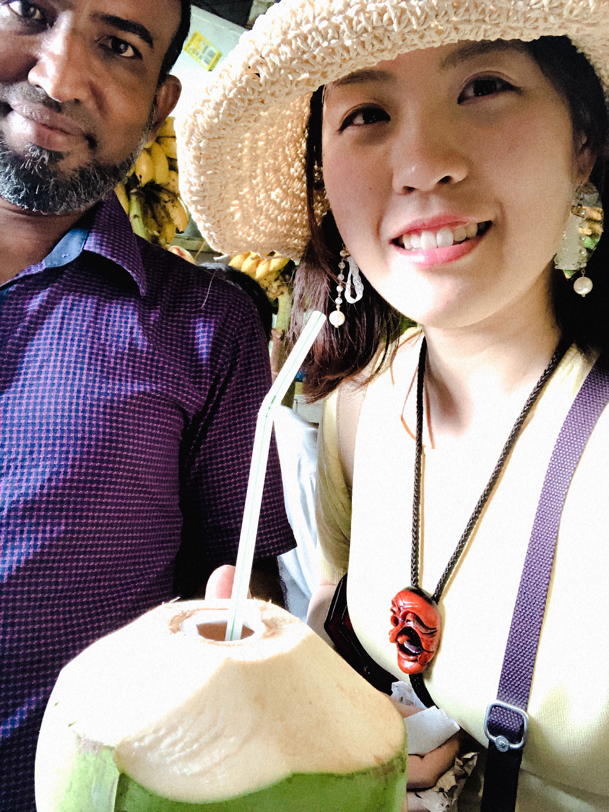 감독님이 즉석 코코넛쥬스를 사주셨어요. 우리나라에도 요즘 한강의 밤시장에 가보면 코코넛쥬스를 팔기도 하지만 코코넛 생산지에서 먹는건 또 다르잖아요. 냉장고에 보관하는 과일은 아니다보니 쥬스가 차갑진 않았지만 적당히 달달하고 맛있었어요. 사진의 청년이 코코넛을 칼로 쓱쓱 깎아서 금방 쥬스를 만들어주더니, 쥬스를 다 먹고 코코넛컵을 돌려 주니까 코코넛컵을 다시 잘라서 코코넛의 과육도 먹어보라고 줬어요. 이것도 부드러워서 맛있었어요!