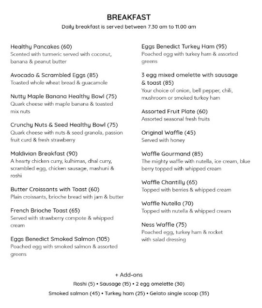이곳은 아침만 파는 곳이 아니고, 오후와 저녁에도 영업을 하는 카페 형식의 레스토랑이었어요. 피자, 햄버거, 볶음밥 등도 먹을 수 있지만 아침에도 위 사진의 메뉴판에서 볼 수 있는 것처럼 다양한 메뉴의 아침식사를 제공하기 때문에 브런치카페라고 볼 수도 있을 것 같아요. 몰디브식 식사를 하고 싶었던 저는 메뉴판에서 몰디브아침식사(Maldivian Breakfast)를 골랐어요. 저, 감독님, 감독님친구인 여자분 2명과 함께 식사를 했는데, 그 중 1명은 훈제연어 에그베네딕트(Eggs Benedict Smoked Salmon)를 골랐고 나머지는 저와 같은 메뉴를 먹었어요. 가격은 우리나라돈으로 계산해봤을 때, 4,000~8,000원 정도라서 괜찮은 가격이라고 생각됩니다.