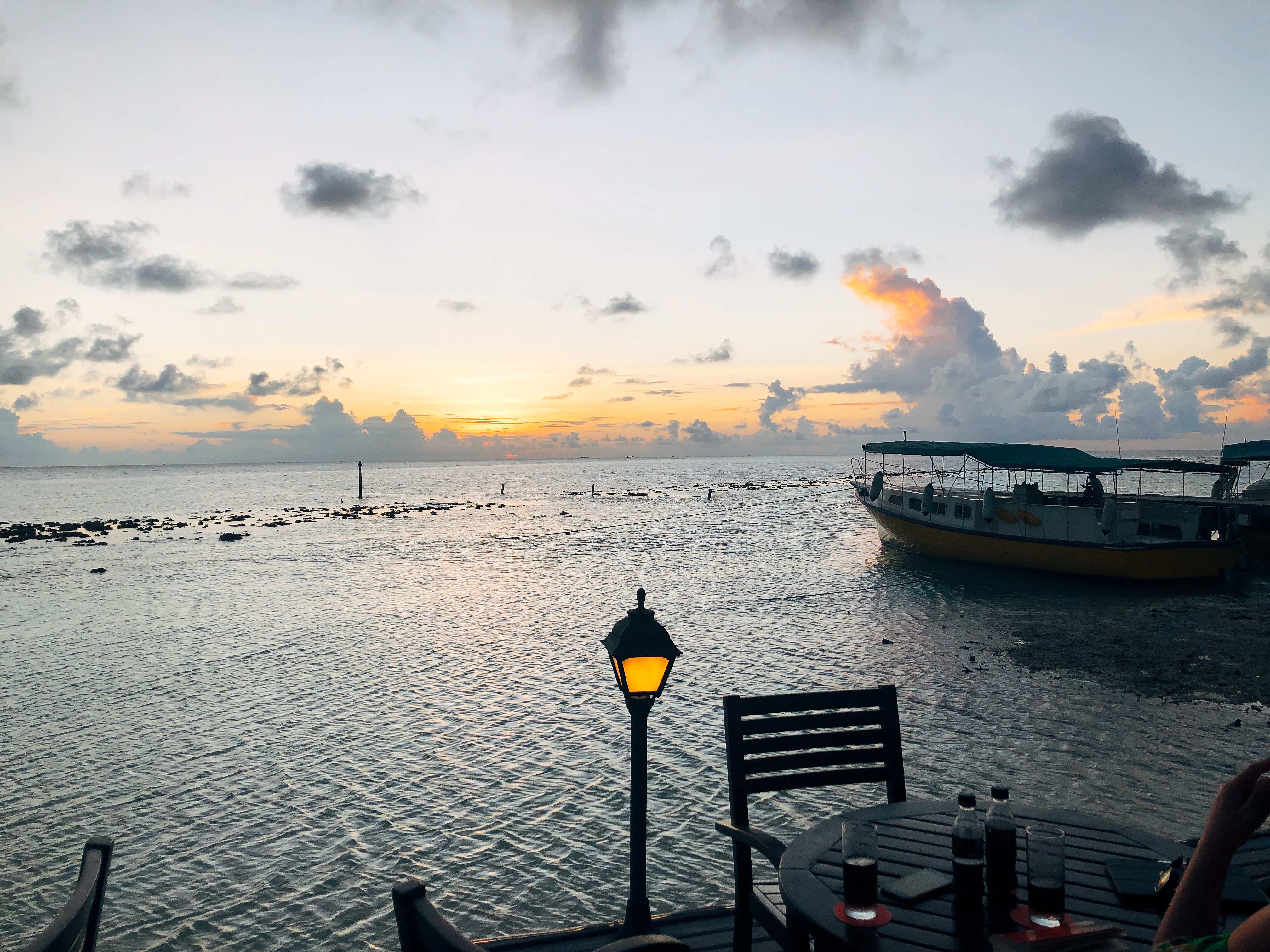 그렇게 얻어진 사진이 위에 있는 사진이에요. 해가 저물자 에메랄드빛 바다는 회색빛이 되고, 어두워지자 켜진 등불과 저멀리 노을빛이 회색물살을 아름답게 비춰요. 그렇게 훌루말레에서는 해돋이를, 리조트에서는 노을을 보았습니다.