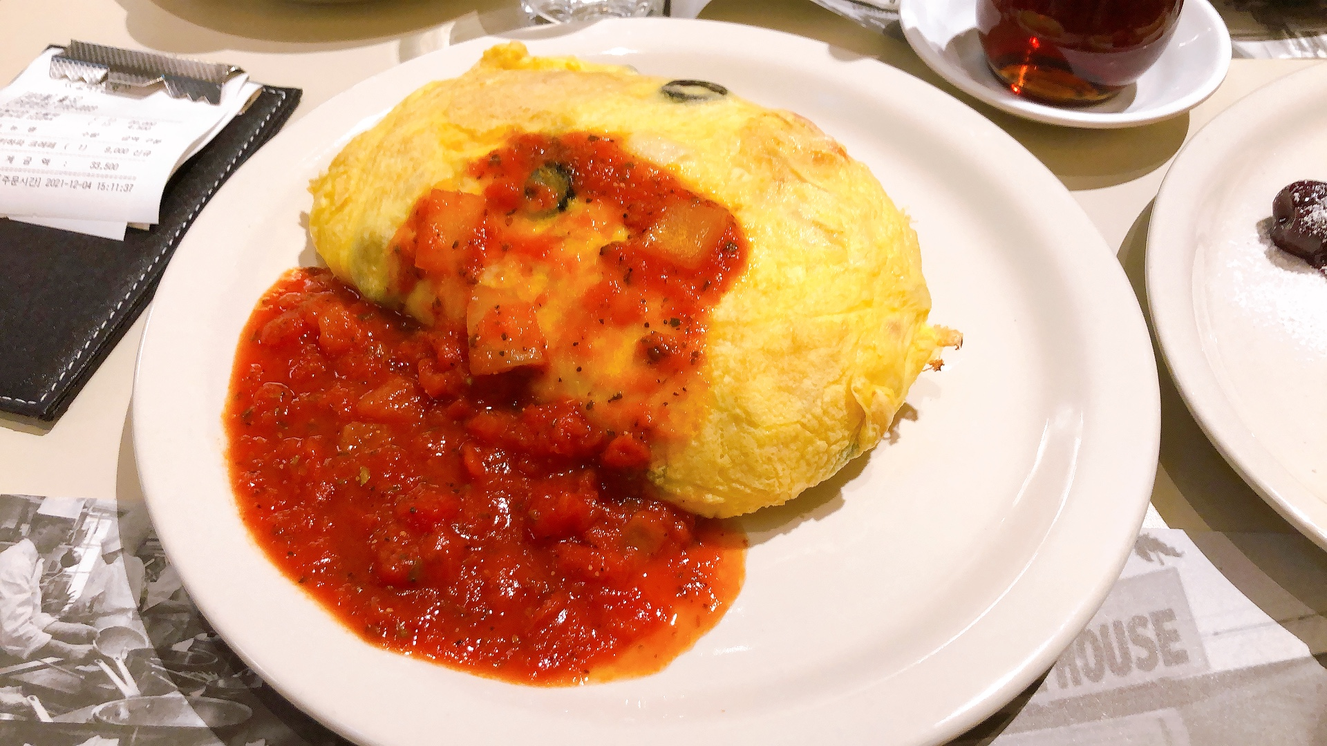 소스는 쨍한 느낌의 토마토소스였고, 오믈렛은 야채와 함께 가운데엔 치즈도 듬뿍 들어있어서