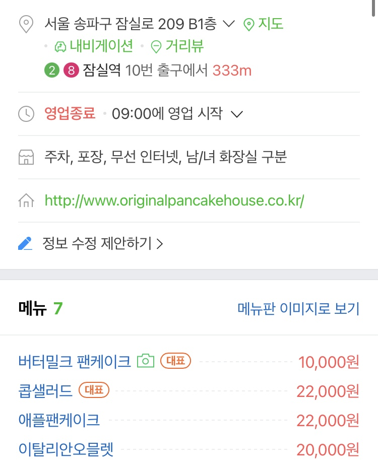오리지널팬케이크하우스의 주 메뉴는 팬케이크와 오믈렛, 샐러드 등의 브런치메뉴였어요. 가격이 꽤 비싼 편... 하지만 후에 언급하겠지만 비쥬얼과 맛은 보장!! 드립커피는 4,500원으로 한 번 시키면 무제한 리필이고, 다 먹고 나갈 때도, 테이크아웃할 수 있어요! 혹시나 해서 물어봤는데 테이크아웃도 해준다고 해서 너무 좋았다는!!👍👍👍 영업시간은 오전9시~오후9시! |